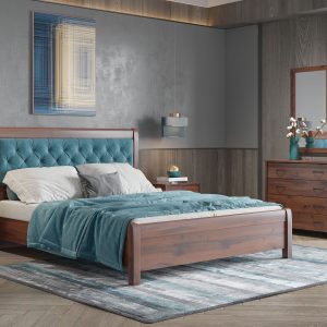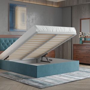 Κρεβάτι 1.60*2.00*1.20 με μπλε ύφασμα σε χρώμα νέο καρυδί